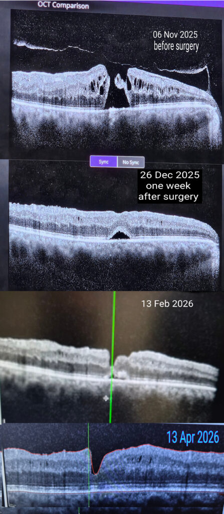 At the bottom of the picture is the latest image of my macular, taken yesterday. The ophthalmologist says it is an improvement. Normally would be a gentle dent there instead of a valley. I think the thing to notice is at the bottom of the valley is thicker to the bottom of the macular.